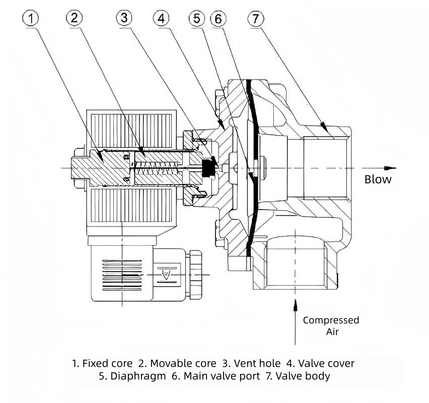DMF-Z-20 täisnurkne elektromagnetimpulssklapp Diafragma jagab elektromagnetilise impulsi ventiili esi- ja tagakambriks. Suruõhu tarnimisel siseneb see gaasiklapi ava kaudu tagumisse kambrisse. Sel hetkel sunnib tagumise kambri rõhk membraanikomplekti klapi väljalaskeava tihendama, asetades elektromagnetilise impulsi ventiili "suletud" olekusse.